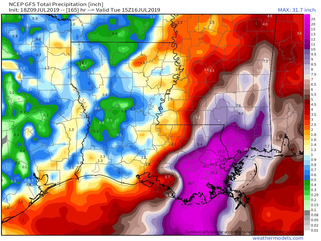 Wherever this thing lands, someone is dealing with major flooding. The hot pink area is landfall, currently LA, with significant impacts to New Orleans. This area show a 17 to 25 inches of rain.....begin preparing if you live in the Florida panhandle to LA. Once it spins up, we will know more about location.