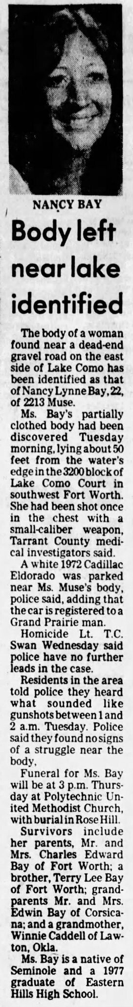 On May 12, 1981, Nancy Bay was found deceased in a field at 3200 Lake Como.