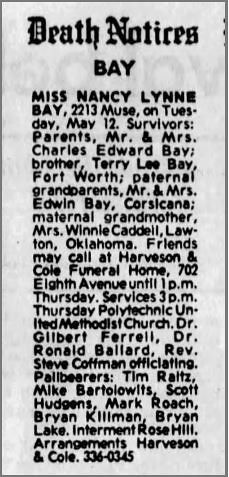 5/12/81: Remains Found: 3200 Lake Como, Ft Worth, TX (1 mile from club)