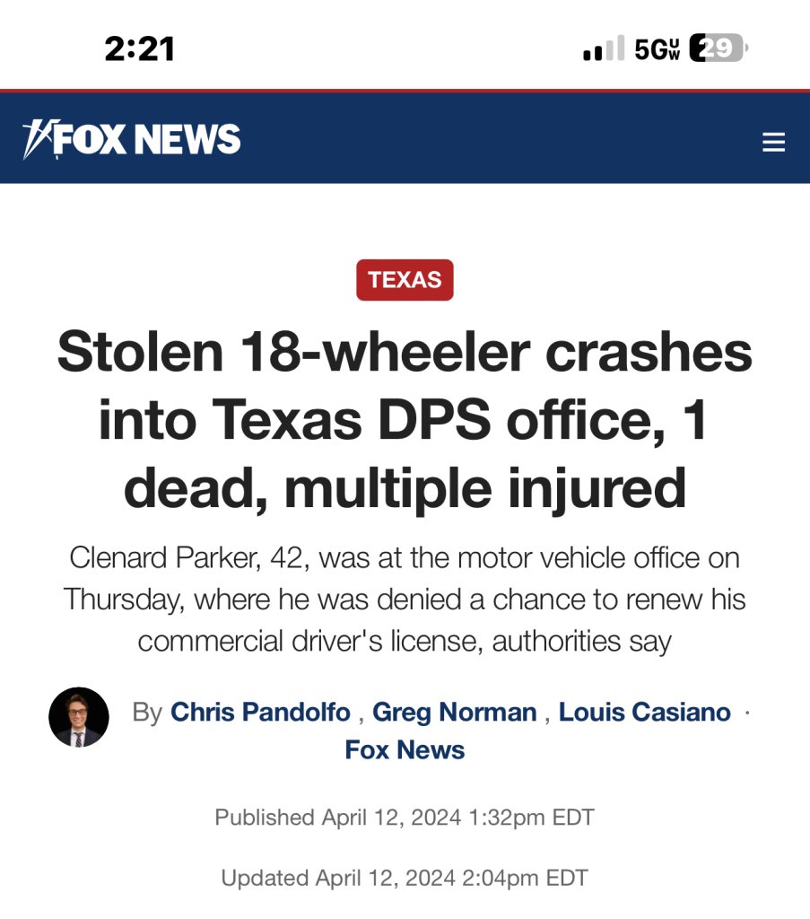 Clenard Parker went to the Texas DPS (Department of Public Safety) office in Brenham, TX on Thursday, 4/11/24 to renew his CDL license. It was denied.