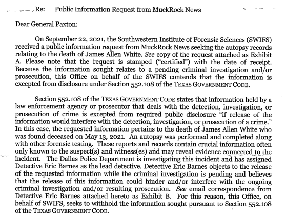 Well, got a response from the office of the Texas Attorney General, who said what I was expecting - they cannot share information. However, this does at least confirm the case is still open, and his autopsy has been completed. Also, it mentions it, but I have not received the email correspondence from the office of Detective Barnes yet- if I do receive it I'll share it as well.