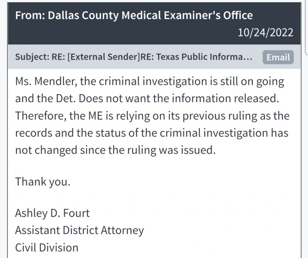 I really don't believe that Dallas PD would keep this case open if they knew it it was a suicide. As someone posted earlier, they have a duty to keep the public informed and they certainly don't need to release any of the details but they could close it and say we do not suspect foul play, and that would be the end of it. either they do not know or they know it's a homicide, but have been unable to develop any convincing leads. It is so sad though Allen seem like such a lovely person. His family deserves answers.