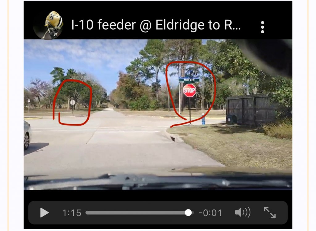 And yes, I was indeed traveling on the one-way feeder away from the Wilcrest/I-10 intersection, in the direction of Redhaw (Eldridge @ I-10 area, just past the Omni).