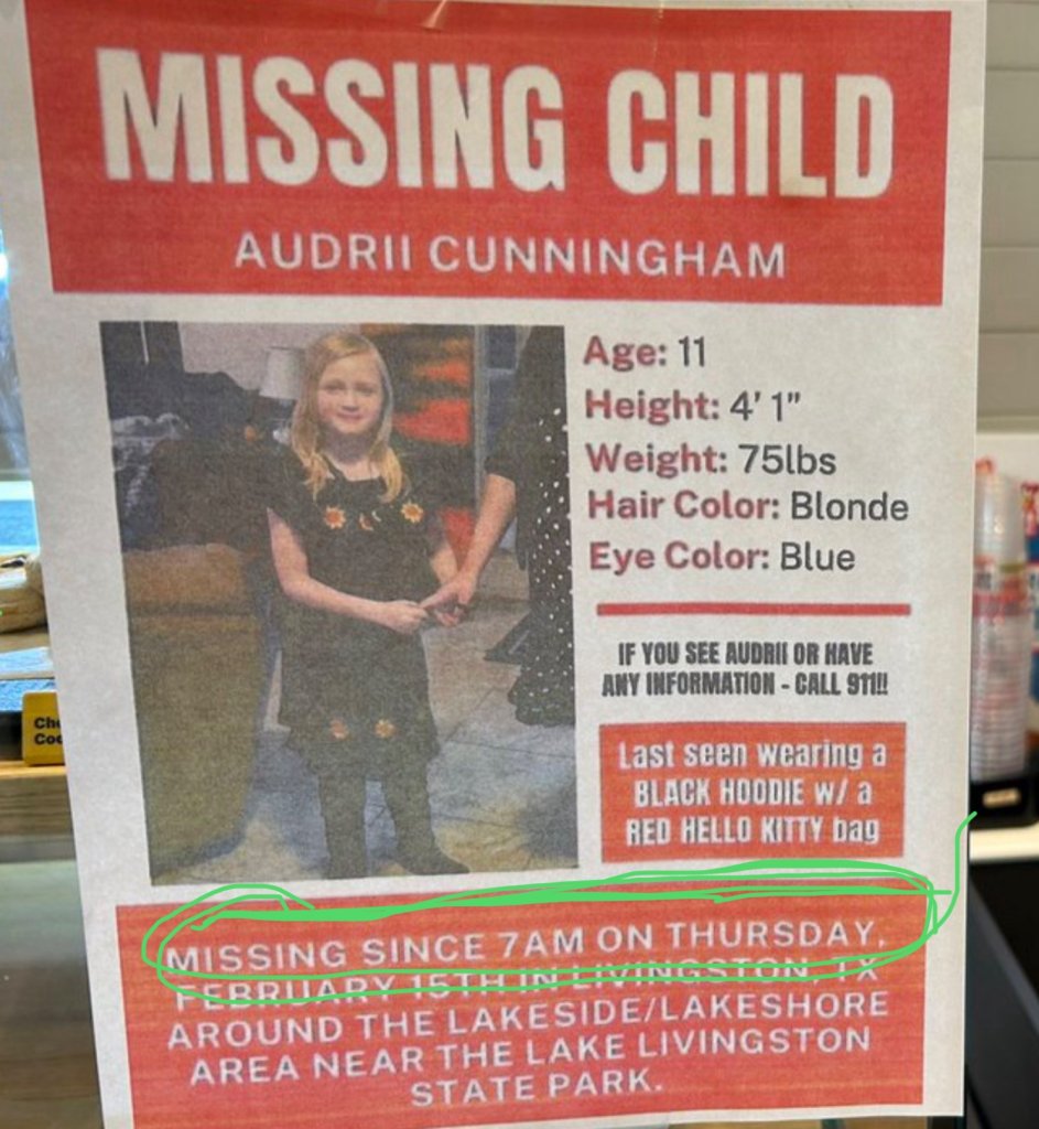 Found Deceased TX - AMBER Alert issued for 11-year-old Livingston, TX Girl - Audrii Cunningham - 15 February 2024