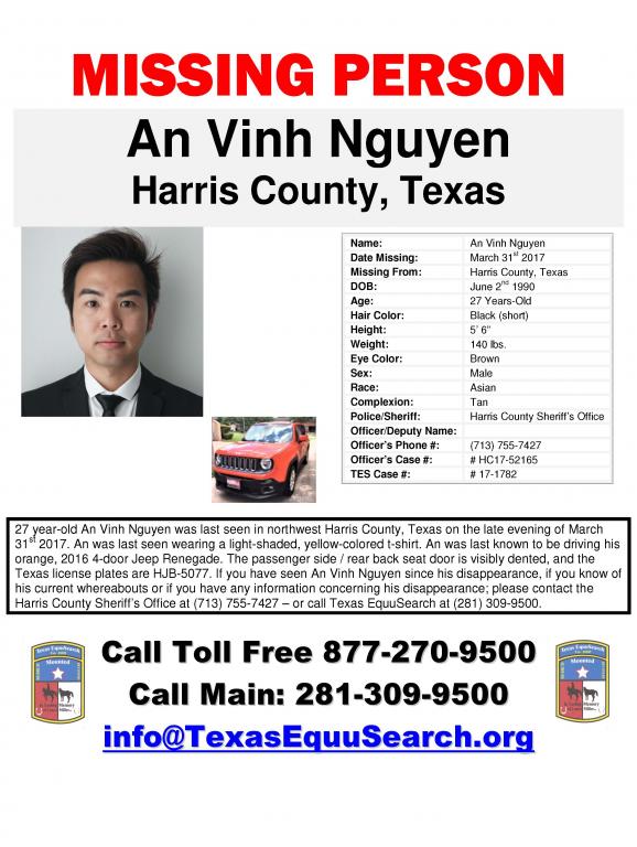 "A 27-year-old University of Houston student has been missing since Friday. An Vinh Nguyen was last seen driving an orange, 2016, four-door Jeep Renegade in northwest Harris County. He studies hotel restaurant management at UH, spokesman Mike Rosen said.