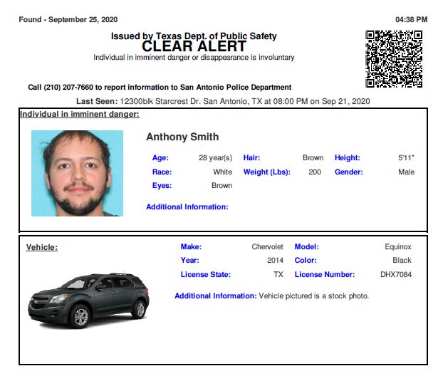 Anthony Eugene Smith was last seen on the 12300 block Starcrest on the Northeast side of San Antonio Monday, September 21, driving a black Chevrolet Equinox with Texas license plate DHX7084.