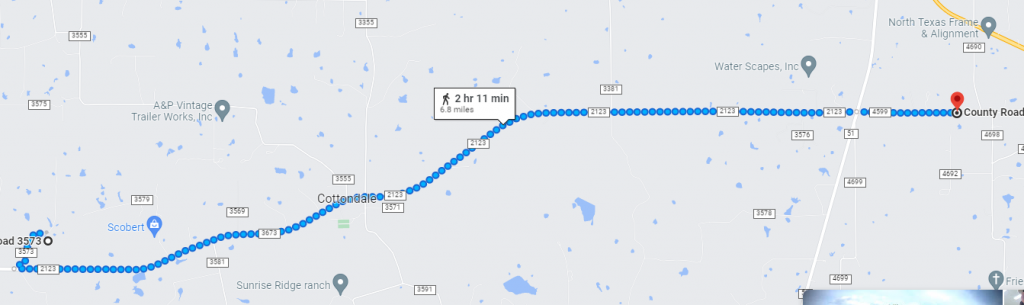 This is 6.8 miles from her home. It would take 2 hrs 11 min to walk. I don't know how she could walk 2 hours and not be seen..