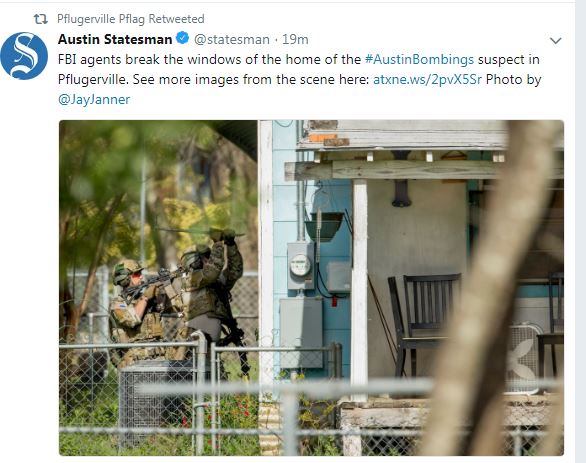FBI agents break the windows of the home of the #AustinBombings suspect in Pflugerville. See more images from the scene here: http://atxne.ws/2pvX5Sr Photo by @JayJanner