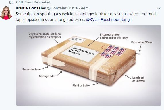 Some tips on spotting a suspicious package: look for oily stains, wires, too much tape, lopsidedness or strange adresses. @KVUE #austinbombings