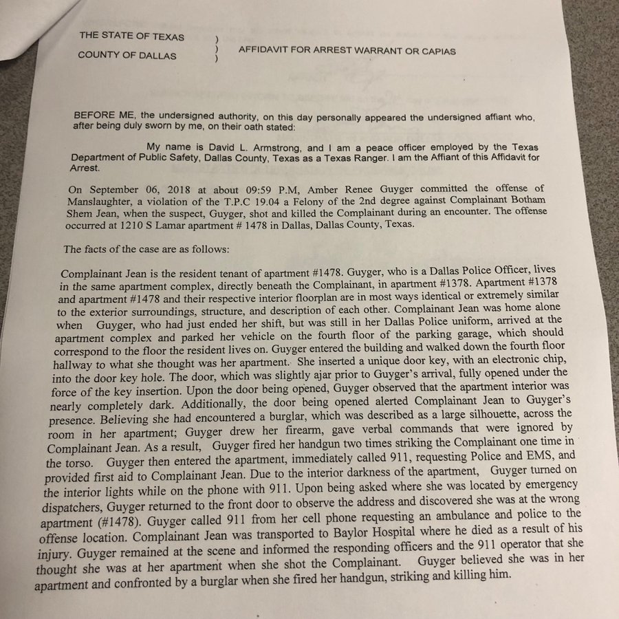 According to the affidavit "Guyger drew her handgun, gave verbal commands that were ignored and fired her weapon twice, striking 26-year-old Botham Jean once in the torso."
