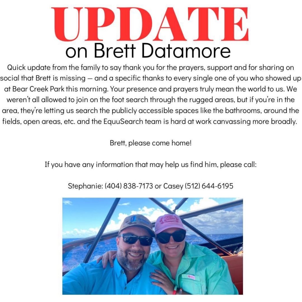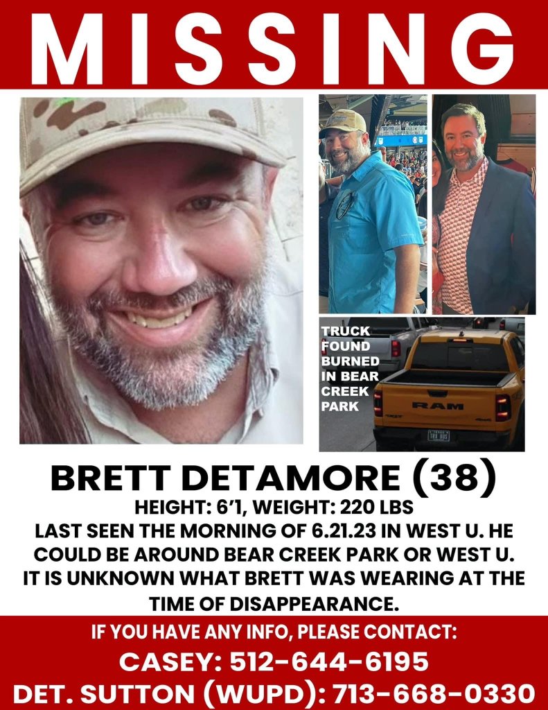 Detamore has been missing for nearly 2 days. His new Dodge truck was found torched at the park off Clay Road. Thank you Texas EquuSearch for all your assistance.