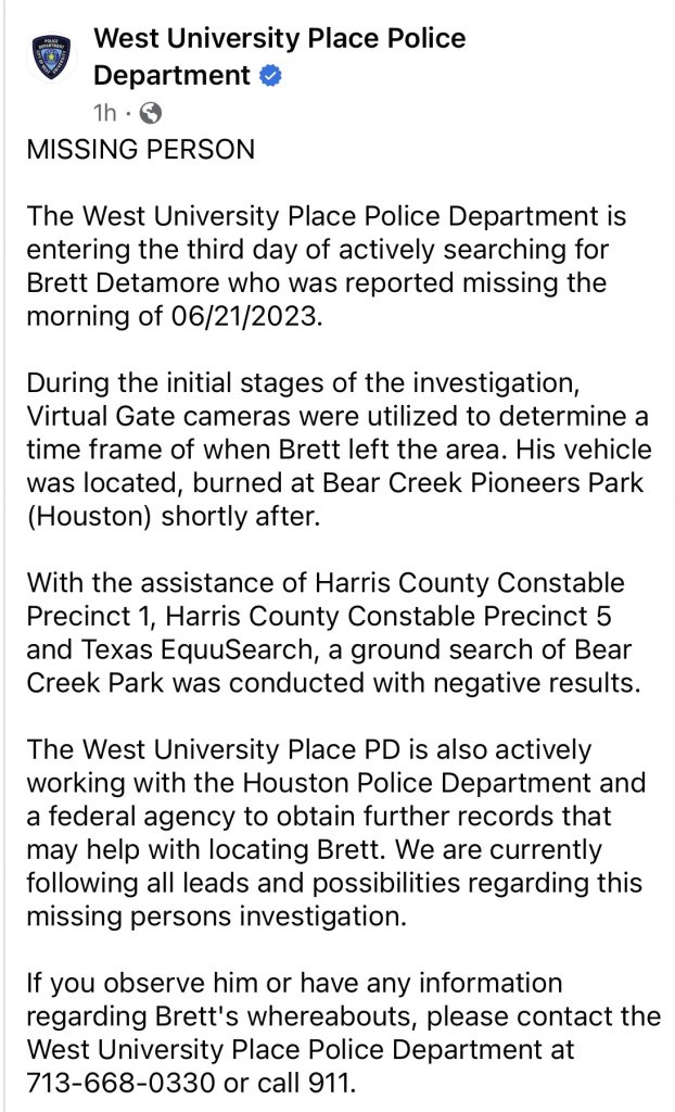 During the initial stages of the investigation, Virtual Gate cameras were utilized to determine a time frame of when Brett left the area. His vehicle was located, burned at Bear Creek Pioneers Park (Houston) shortly after.