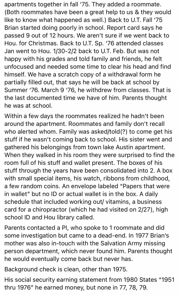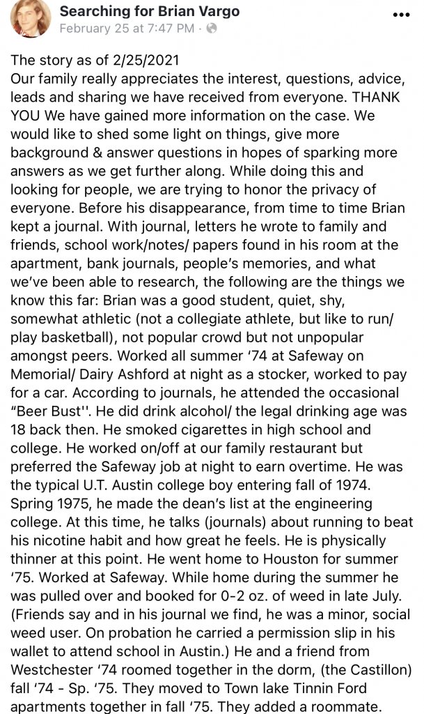 Vargo was a Univ of Texas at Austin Student. Vargo dropped out of school in March. Vargo traveled to Colorado in his vehicle. His vehicle broke down in Colorado. Vargo travel to Houston Texas to pick up the vehicle's title. His mother dropped him off at the bus station in Houston (unknown date). Family was notified he had not returned to his apartment. When family arrived at his apartment in Austin Texas Vargo's wallet was in the apartment.