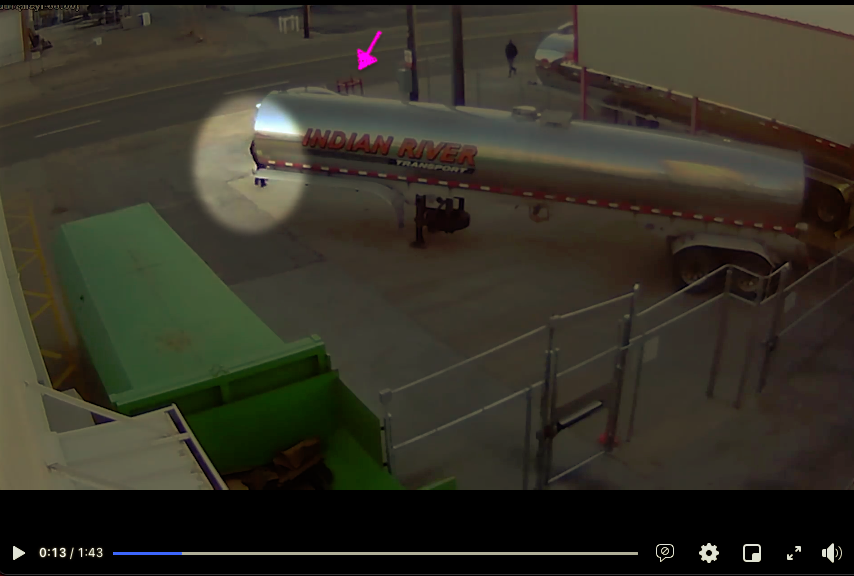She goes through the gate beside a tanker trailer, walks to the end of the tanker, and turns right on Third Ave. You can see the other person crossing behind her. It looks like they might say something to each other.