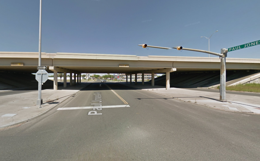 The overpass at intersection of S Padre Island Dr and Paul Jones Ave certainly makes more sense, at least in terms of visibility of individuals under the "bridge"/overpass by a passing driver. However... at night... I wonder what the visibility would be underneath the bridge. And even further- I am curious how someone who doesn't personally know Caleb would recognize and recall seeing him in a group of individuals gathered under the overpass.