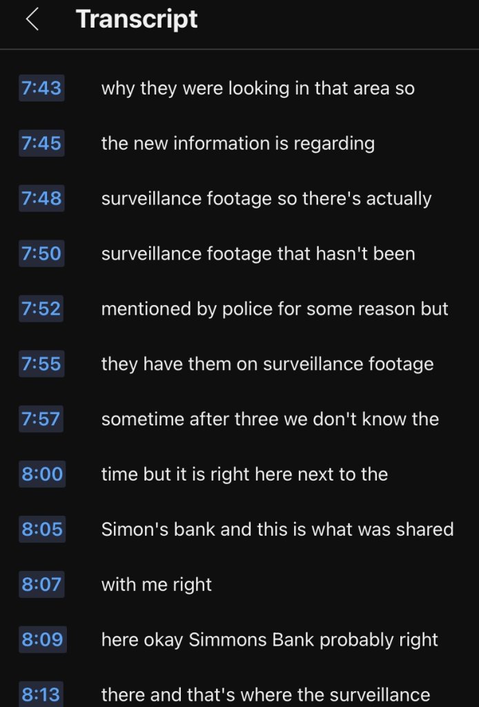 Right, Hughs simply sets forth that there is extra surveillance footage kept back by law enforcement showing Caleb sometime after 3 am walking south near Simmons bank. No mention of source or if it comes from family or an inside source.