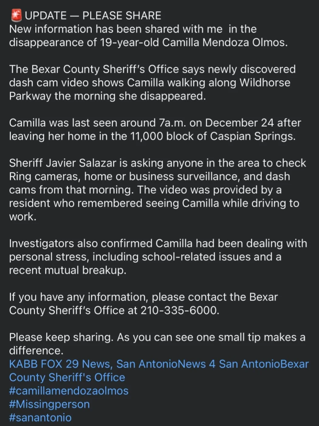 Camila was last seen leaving her residence at approximately 6:58 a.m. on Wednesday, December 24, 2025. Video footage from that time shows an unknown individual, believed to be Camila, searching inside her vehicle for an unidentified item. Moments later, the footage ends. It is believed that she left the residence on foot, as her vehicle remained at the location.