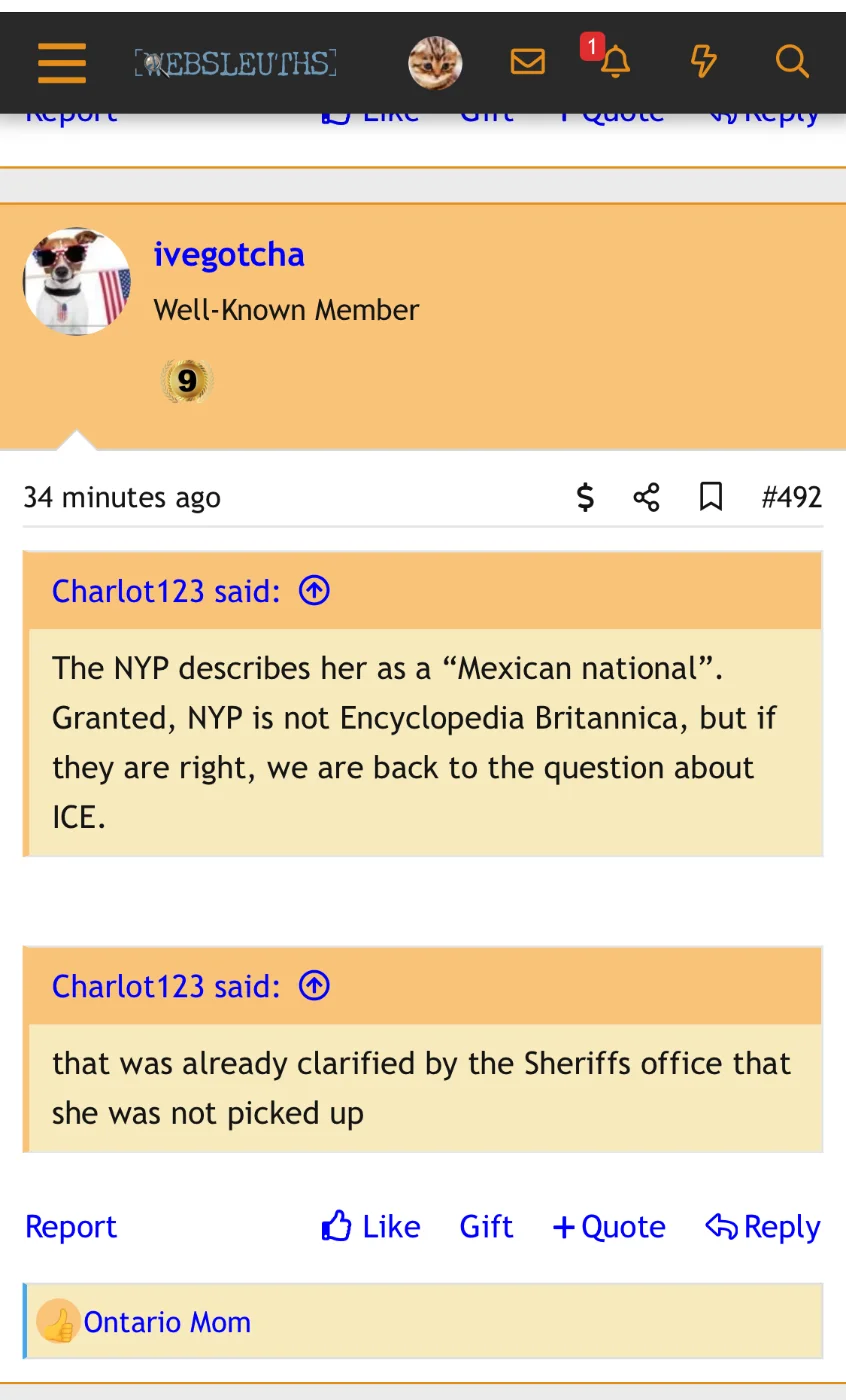 Yes it was the comment about the ICE ... could she have been picked up by ICE... and my comment was NO it was already determined that she was not picked up@ivegotvha in your post #492, which I cannot quote (the internet is feeble here), where is the origin of the second post under my name? I can’t find it
