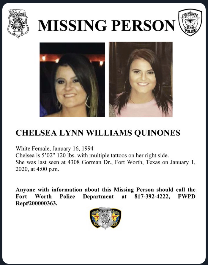 Authorities say Chelsea Lynn Williams Quinones was last seen around 4 p.m on Jan. 1 near the 4300 block of Gorman Drive.