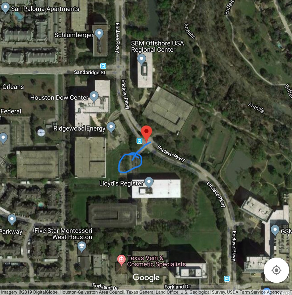 Google earth view of the parking lot/old cul-de-sac today. Blue circle around old cul-de-sac.