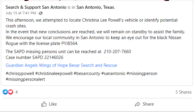 I did read some posts on FB from Search & Support San Antonio, and it is a little confusing. They are assisting law enforcement in their efforts to locate, and apparently they( SAPD) have a missing persons task force handling it but on the San Antonio LE website they don't have a missing persons unit unless that falls under their SVU operations. Then if you read what law enforcement says it appears as if there is no investigation because no foul play is suspected. The problem is the general public in that area may be confused as well, this may cause locals in that area no to be on the look out or call in with possible tips and pertinent information. I think the general message that needs to be conveyed by Law Enforcement is that this is a mother who is missing be it by her own accord or not and she needs to be found for the well being of her family.
