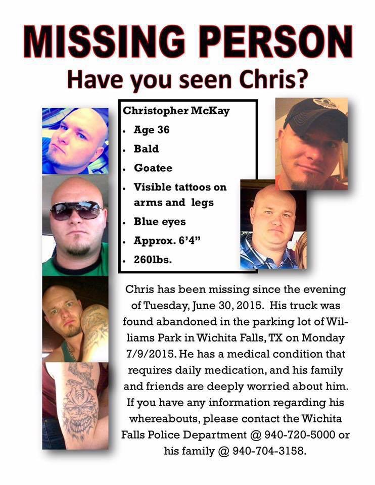 36-year-old Christopher McKay has been missing since June 30th. His truck was found at Williams Park in Wichita Falls on July 9th, but his whereabouts are still unknown."