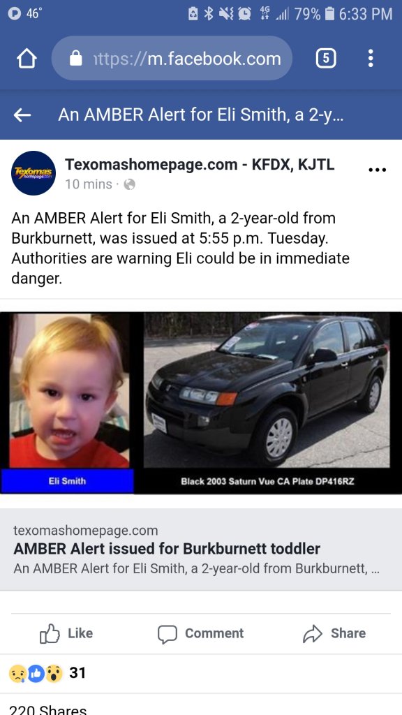 BURKBURNETT (KFDX/KJTL) - An AMBER Alert for Eli Smith, a 2-year-old from Burkburnett, was issued at 5:55 p.m. Tuesday.