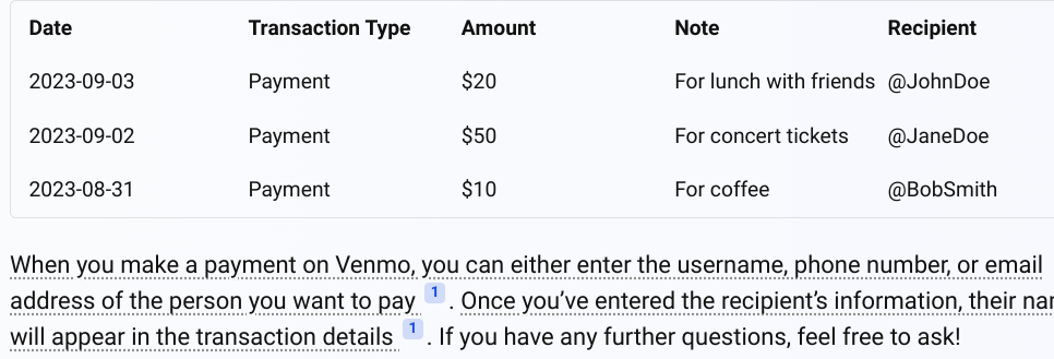 Below is a SS of an AI generated Venmo transaction statement and not how a single transaction would appear when using the app on your phone.