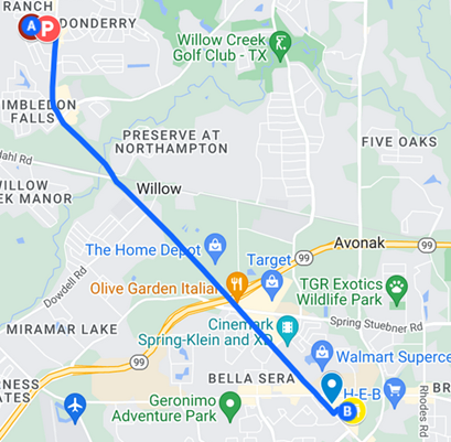 Point A – Barraza Home; Point B – Lowe’s; (P) – Goddard School