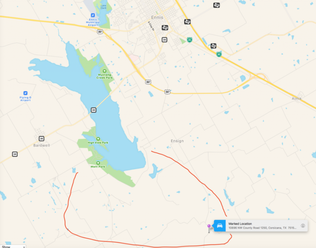 The the upstream tributaries of Chambers Creek are to the south and west of Lake Bardwell. I don't think any of the roads she would take to get back to her Mom's place cross water/streams that would end up in Chambers Creek. Most of the stream water around Ennis appears to flow into Cummings Creek, running kind of parallel to Chambers Creek. Image with pin point of Ensign Road/Chambers Creek intersection. Upstream areas of Chambers Creek circled in red (as best that I can estimate from Maps.