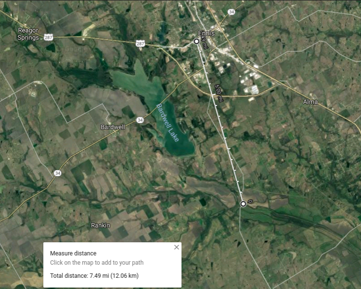 The the upstream tributaries of Chambers Creek are to the south and west of Lake Bardwell. I don't think any of the roads she would take to get back to her Mom's place cross water/streams that would end up in Chambers Creek. Most of the stream water around Ennis appears to flow into Cummings Creek, running kind of parallel to Chambers Creek. Image with pin point of Ensign Road/Chambers Creek intersection. Upstream areas of Chambers Creek circled in red (as best that I can estimate from Maps.