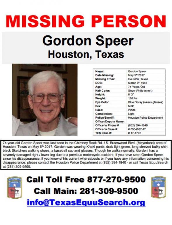 Gordon Speer was last seen near Chimney Rock and South Braeswood wearing khaki pants, a long-sleeved bulky shirt, black Sketchers walking shoes, a baseball cap and glasses. He is white, 63, 180 pounds with blue-gray eyes and glasses.