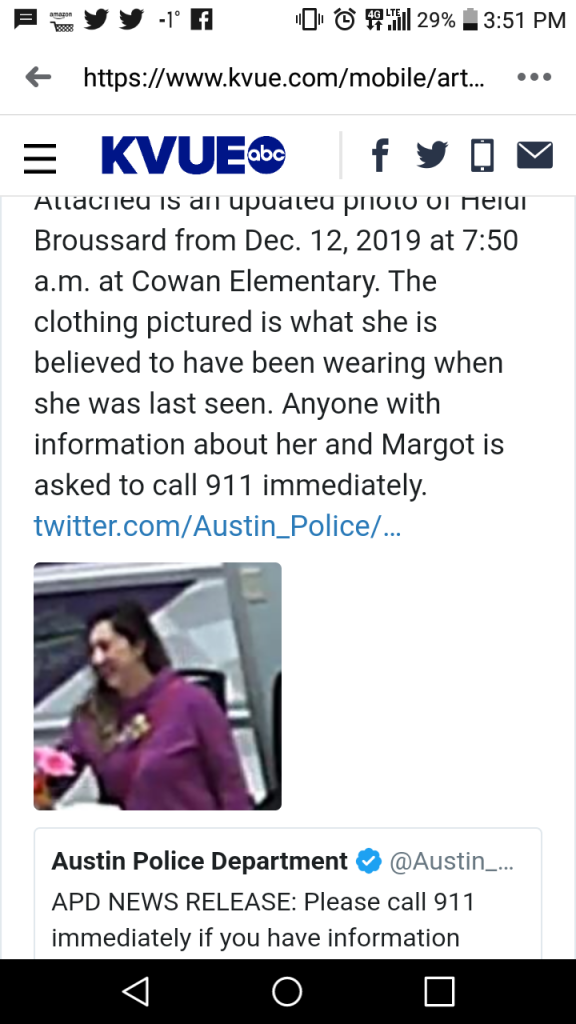 The statement about the door being open is what is way off about him not calling the school. If it were just she and baby were not there and car still there, I might think they walked the block to the HEB to get groceries. I walk to the store all the time and am there quite a while. But I would NEVER leave my purse at home or phone and never ever leave the door opened. I don't leave it unlocked even when I am home. The door and stuff left there is what I see as suspicious and not necessarily her s/o. There are several possibilities including human trafficking which IS a problem along the I-35 corridor (Dallas/Austin/San Antonio).What time were they reported missing? And by who? If he got home at 2 and they were not there and door standing wide open. I think he would have checked with the school to see if thier son had been dropped off ( or less he already knew the answer)