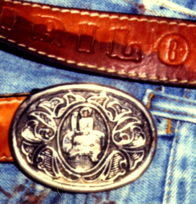 WEARING THUMBS UP BRAND JEANS, LEATHER BELT W/W0RD CIRIL0 EMB0SSED 0N IT, BUCKLE W/PICTURE 0F SADDLE, BLU SHIRT W/PICTURES 0F ICE CREAM C0NES 0N IT, SZ 7 BLK LEATHER L0AFERS