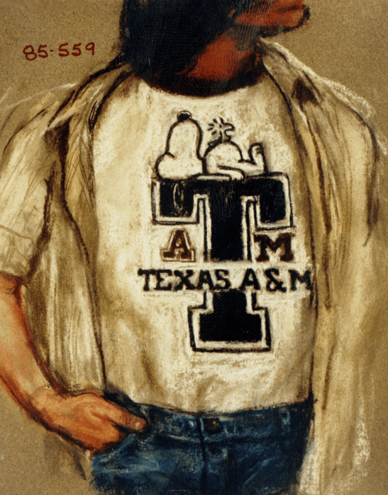- White T-shirt bearing a Texas A&M logo with Snoopy the dog lying over it and a maroon trim