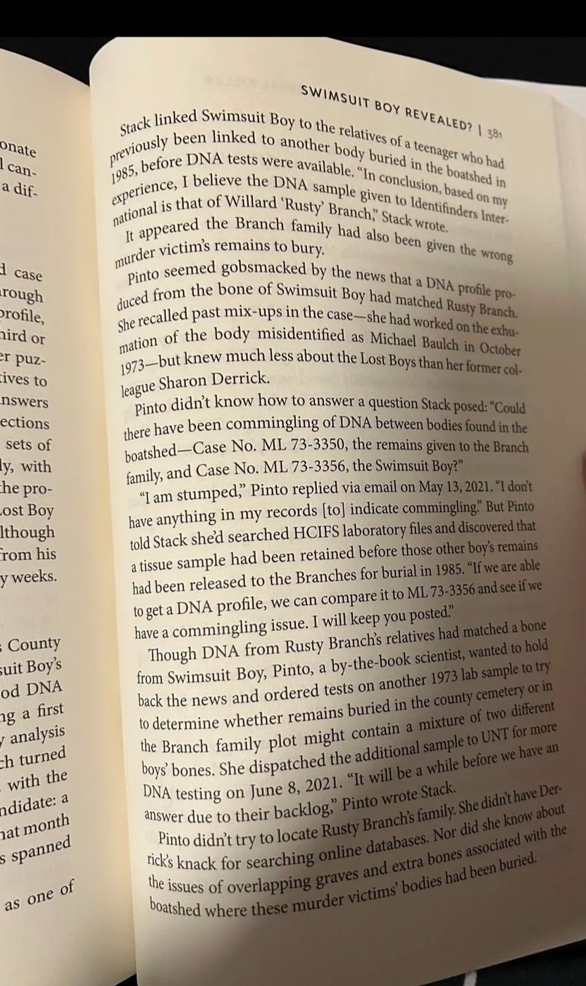 I just read in the scientist and the serial killer by lise Olsen, that swimsuit boy has been tentatively id as rusty branch by dna and the rusty branch that is buried is a misidentified boy that was a bit older than rusty.