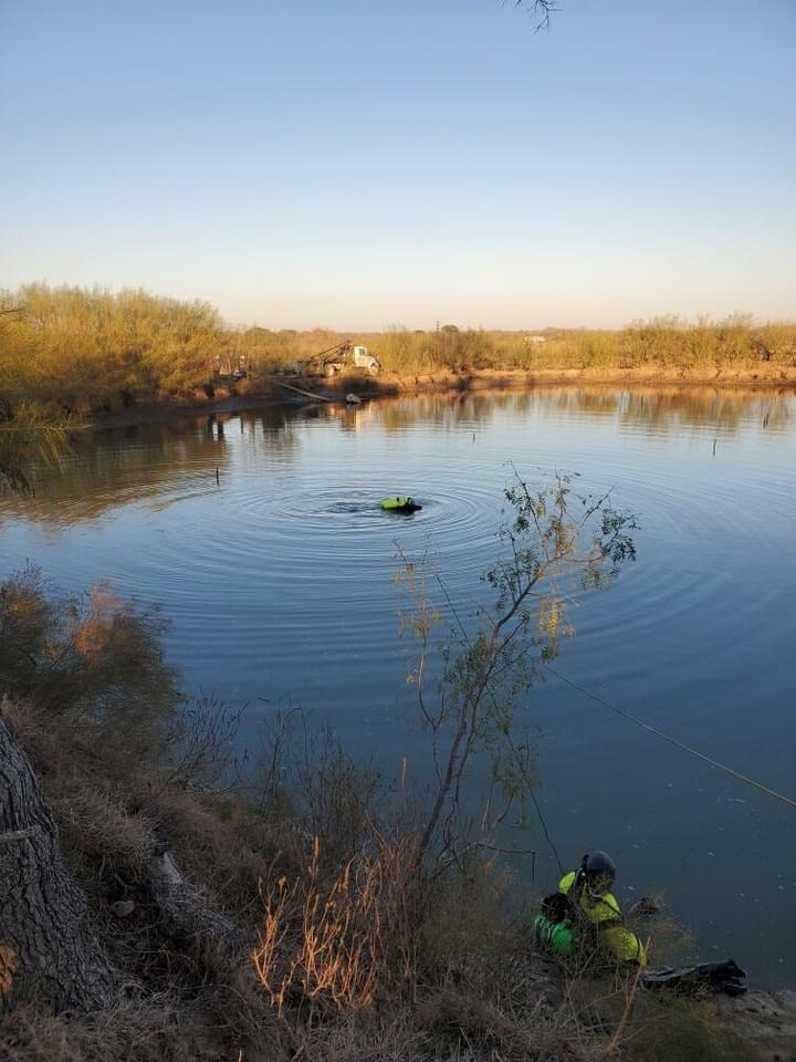 The team was on scene at 1330. At approximately 1430, SHFD-DT Divers, supported by Texas DPS, Texas Game Wardens, TX SAR, and Luling Fire Department small-boat operators, entered the water and began clearing the primary point of interest detected by Game Wardens' side-scan sonar: a shadow detected 25 feet off shore.