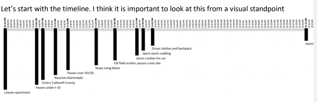 To be clear, it is in Jim's Timeline where Jim places Jason dropping items at 11:42pm.