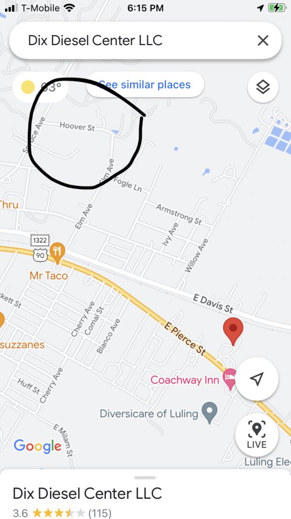 Hoover St is circled in black. Dix Diesel is the red flag on the map.1251 Hoover St, is that off of Spruce, before it turns into Salt Flat Road? Is that were the car was towed?