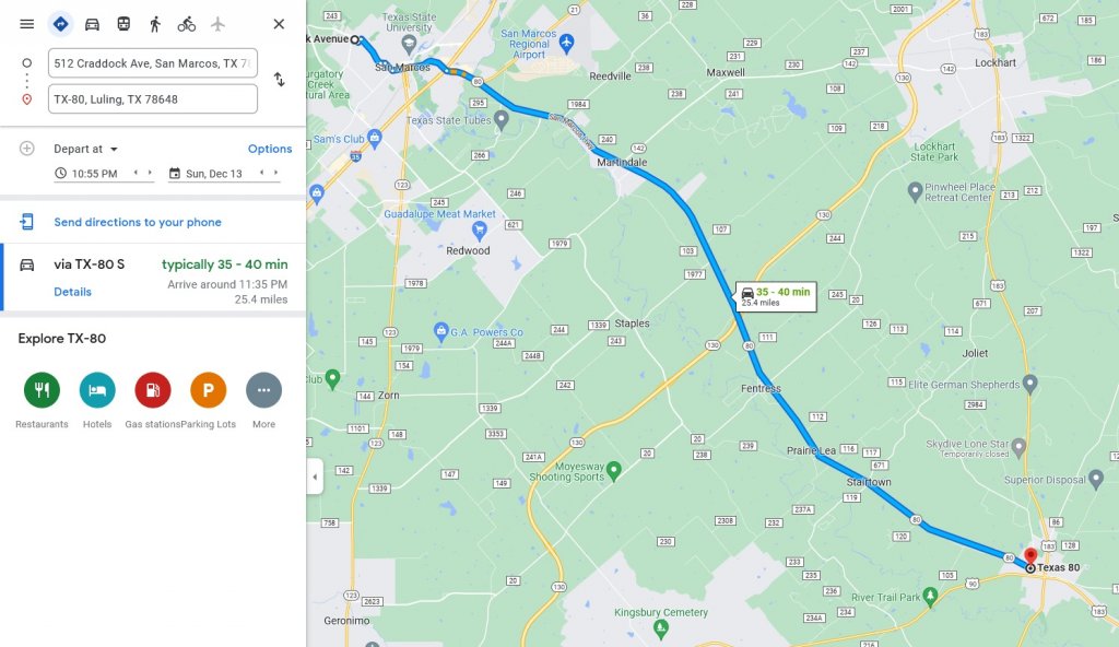- I did a simulated Google Maps route leaving The Retreats Apartment complex 10:55 p.m. and arriving at Hackleberry/Austin St (the site of the last ping). It projects arrival by 11:35 p.m. or 11 minutes faster than when LE says he passed that area.