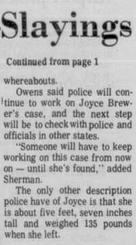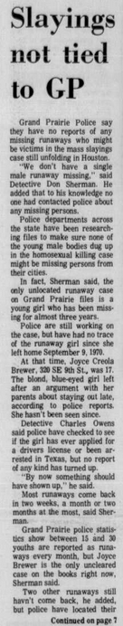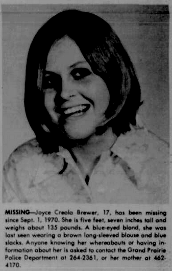 My mother lived in Grand Prairie for several years when she was growing up, until she quit school and ran away to California in 1972. I mentioned to her that I had joined this site and on a long shot, I asked her if she knew Joyce Brewer. She thought she did know her, on the periphery. Joyce would have been about three years older than her. My mother said that she had a friend named Jack (she called him Jackie) Brewer, and that his sister was named Joyce. She was sure they were the same person. She said she never knew that Joyce had been reported missing, or that she had run away from home. Anyways, I know I didn't really contribute anything "new", but maybe it will renew some interest in the thread.