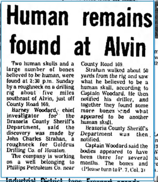 As many as nine bodies were discovered in Brazoria County between 1971 and 1975 and as many as 21 girls reported missing in Harris, Galveston and Brazoria counties in 1971 and 1972, Lt. Matt Wingo, sheriff’s investigator heading the case, said. Authorities will try to determine if the new evidence will suggest a connection among any of those cases, Wingo said.