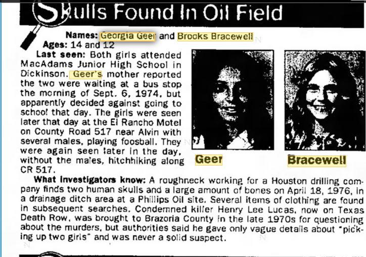 Chief investigator for the Harris County Medical Examiner’s office, Cecil Wingo, said Dr. Joseph Jachimczyk identified the remains found off CR 169 as 14-year-old Georgia Geer and 12-year-old Brooks Bracewell, both of Dickinson. The girls died of “blunt trauma to the head,” or being struck in the head by a blunt object, Wingo explained.