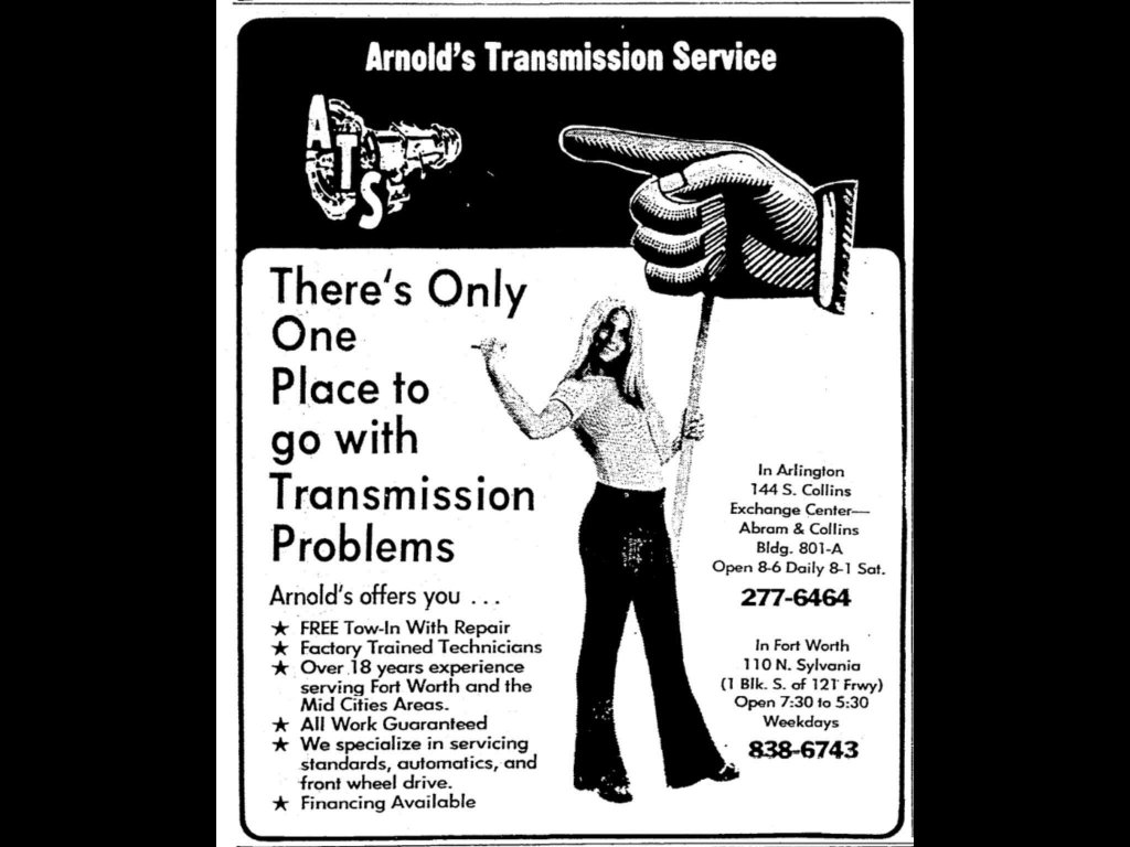 Thought I would post this. I dont know if it already has been or how much help it will be. According to the Texas Secretary of State the business in question was Arnold's Transmission Inc. It was registered June 20 1974 and the agent was Thomas A Trlica. The mailing and office address was 801-A Abram St Arlington but it doesn't say anything about how many physical addresses there may have been. I can not find anything else pertaining to an Arnold's Transmission. It will not let me provide a direct link or I would.
