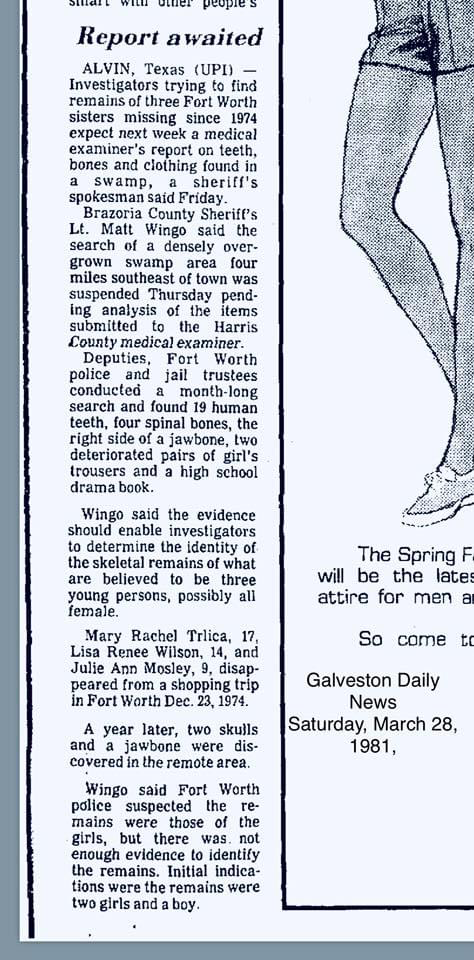 There was also a search conducted near Alvin, at the request of Swaim and a guy from Hawaii who had a tip the girls were there, near an oil tank IIRC, but all that was found there were scattered bones determined to be animals, not human. I also can’t find the link to this article, but it is in one of the threads, at least once.