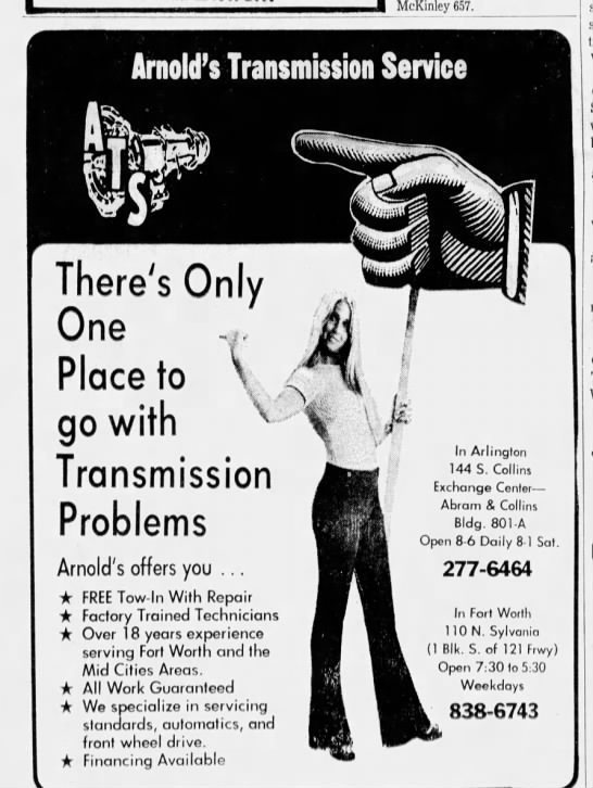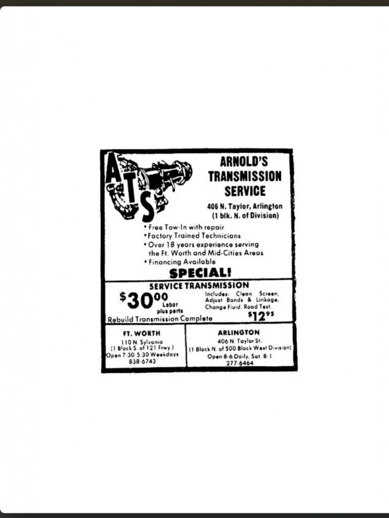 I have gone round in circles trying to figure the locations of the shops out as there is also another Arlington address on the ad posted below. RA gives the west division address when asked where the shop was, but I've been unable to figure out when and why the shop moved, or why there are two addresses given in the ad you posted. Same telephone number though. To be honest I have trouble finding out very much about the shop/businessI don't know if this has been discussed before or maybe I just overlooked it or forgot but there seems to have been two addresses in Arlington for Arnold's Transmission, 144 S Collins and 801 E abram. I took a look at the satellite images for both and 144 Collins does appear to be a garage but 801 abram is an office building. These places are not far apart but have train tracks between them that would cause a longer travel time between the two.There also appears to be only one phone number for both. I don't know if I could somehow be getting this wrong, maybe someone else could take a look at it. I have posted the ad with the addresses and a link with some info on 801 abram, which according to it was a brand new building at that time. IIRC, 801 Abram is also listed as the mailing address with the Texas SoS. I don't know what the exchange center is and I'm a little confused about it, maybe it's nothing but if it is it could be something to know. Can someone help me out on this?