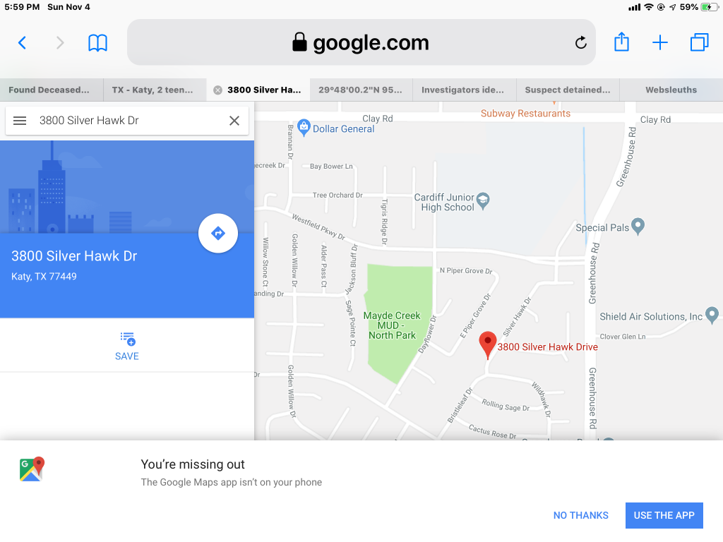 FYI: None of these addresses are in Katy proper. 22592 Round Valley Dr is South of I-10 by a mile or two and just east of HWY 99 (Grand Parkway, the newest and 3rd look to go around Houston.) 6011 Remson Hollow (this one was in my neighborhood) it is in the furthest SW corner of the Katy ISD (almost to Fulshear on the west and Richmond on the south). These are nearly 10 miles apart. 3800 block of Silverhawk Dr is in the far NW boundaries of Katy ISD. It is about 8 miles from the Round Valley address and a little over 16.5 miles from Remson Hollow. While it may not seem that far, when you live there, see the community layouts and traffic, you see there is a big difference. In normal, local traffic it would take nearly 35 minutes to get from Silverhawk to Remson Hollow.