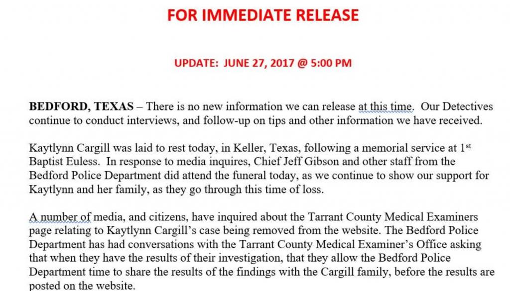 A number of media, and citizens, have inquired about the Tarrant County Medical Examiners page relating to Kaytlynn Cargill's case being removed from the website. The Bedford Police Department has had conversations with the Tarrant County Medical Examiner's Office asking that when they have the results of the their investigation, that they allow the Bedford Police Department time to share the results of the finding with the Cargill family, before the results are posted on the website.