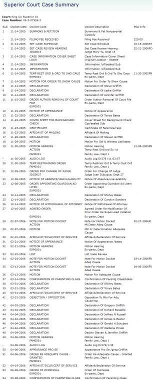 A hearing was held on April 6, 2006 and I have no idea what happened after that but it was silent until 2006 when there was an order of dismissal, which is odd (that usually means the whole case was dismissed) but then a few years later in 2009, it looks like dad filed a certificate indicating he had completed a parenting class.