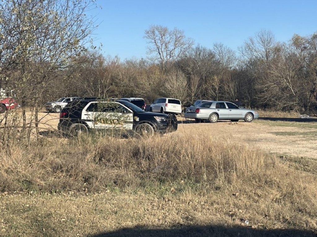 Wooded area completely blocked off by crime scene tape. Chief just arrived at presser location.